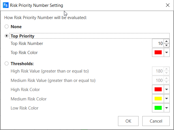 - Risk Priority Number Setting dialog appears, then select Top Priority if you want to highlight the top risk in the PFMEA. Top Risk Number allows you to select how many items to highlight, and Top Risk Color allows you to select the highlight color.