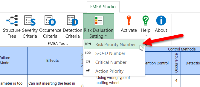 - In the FMEA Studio tab, click Risk Evaluation Setting, then select Risk Priority Number from the drop-down menu.