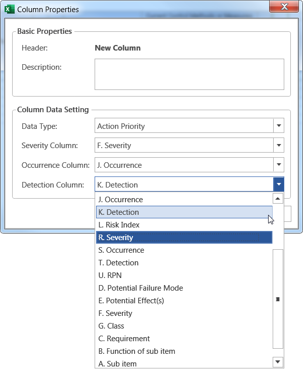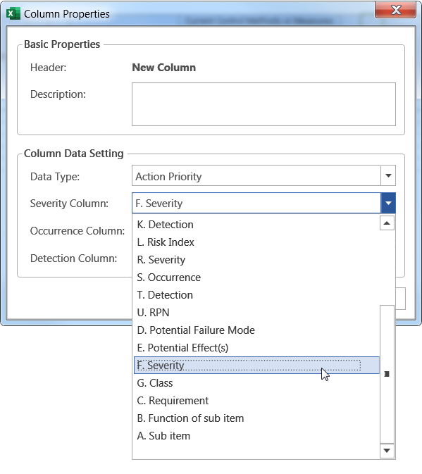 - In the Severity Column combo box, select a column. This column should hold the severity index value. In the following picture, with the “F. Severity” column, F is the Excel column address, and Severity is the label of the header of the selected column.