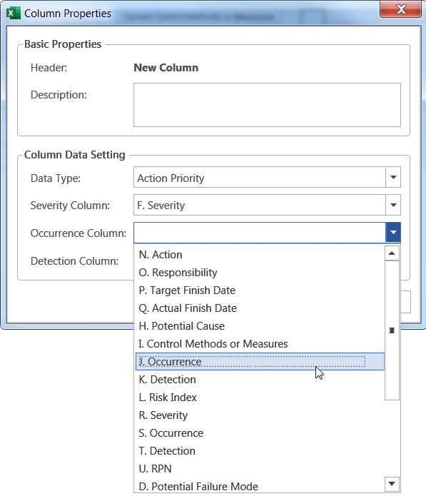 - In the Occurrence Column combo box, select a column. This column should hold the occurrence index value. In the following picture, with the “J. Occurrence” column, J is the Excel column address, and Occurrence is the label of the header of the selected column.
