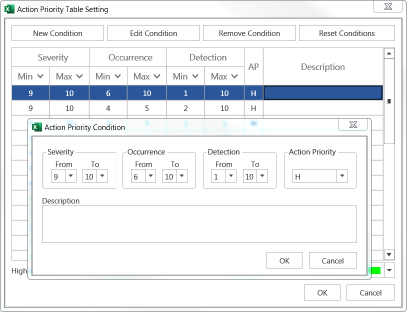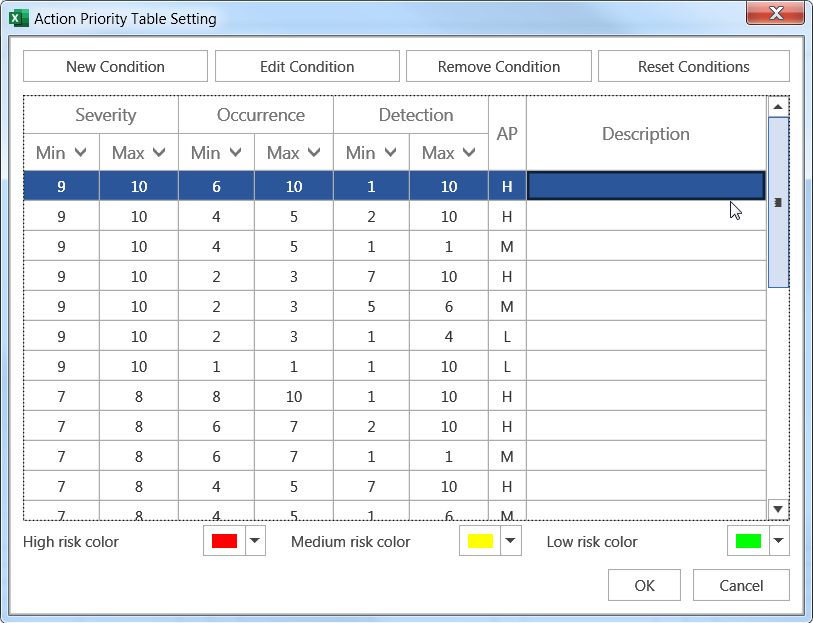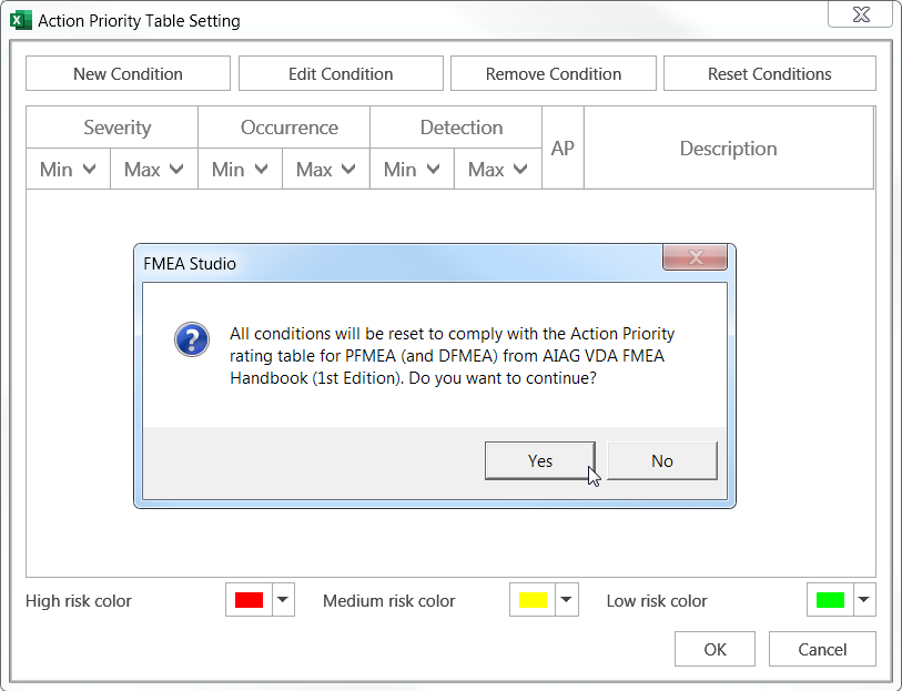 - Risk Priority Number Setting dialog box shows up. Click on Reset Conditions. This button will help you to populate all conditions for AP evaluation with adherence to the AIAG/VDA FMEA Handbook 1s edition.